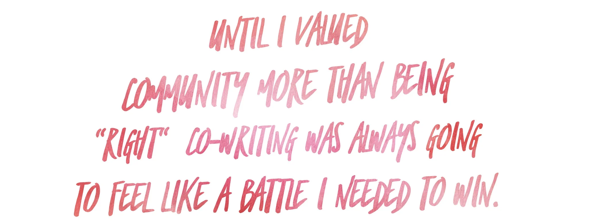 But with community came co-writing. Co-writing felt scary and intimidating. The few co-writes I had done up to that point were not so great. How could I take that private, sacred time I had cherished for many years and open it up to strangers? I was worried about ruining new friendships. I was worried about being vulnerable with my ideas. I was worried I might never like someone else’s ideas as well as my own and I’d have to pretend I did. I was worried I’d end up with songs I wasn’t proud to have my name on. I was afraid if I disagreed in a co-write I'd be labeled "hard to work with."